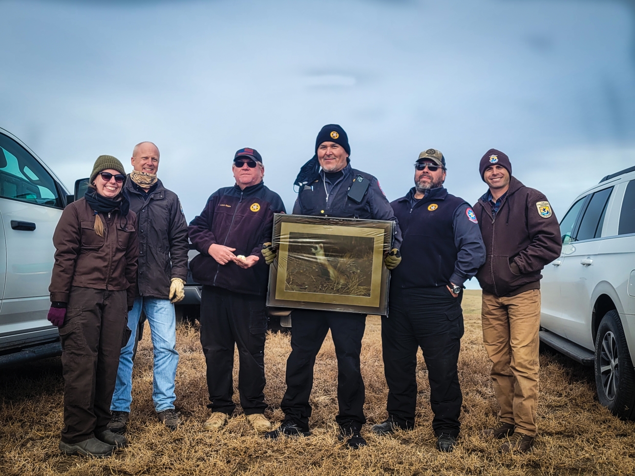 USFWS Biologists Lauren Toivonen and John Hughes, Standing Rock Game and Fish Ranger Waylon Little Eagle, Standing Rock Game and Fish Director Jeff Kelly, Standing Rock Game and Fish Ranger Thomas DeLong, USFWS Field Supervisor Drew Becker.