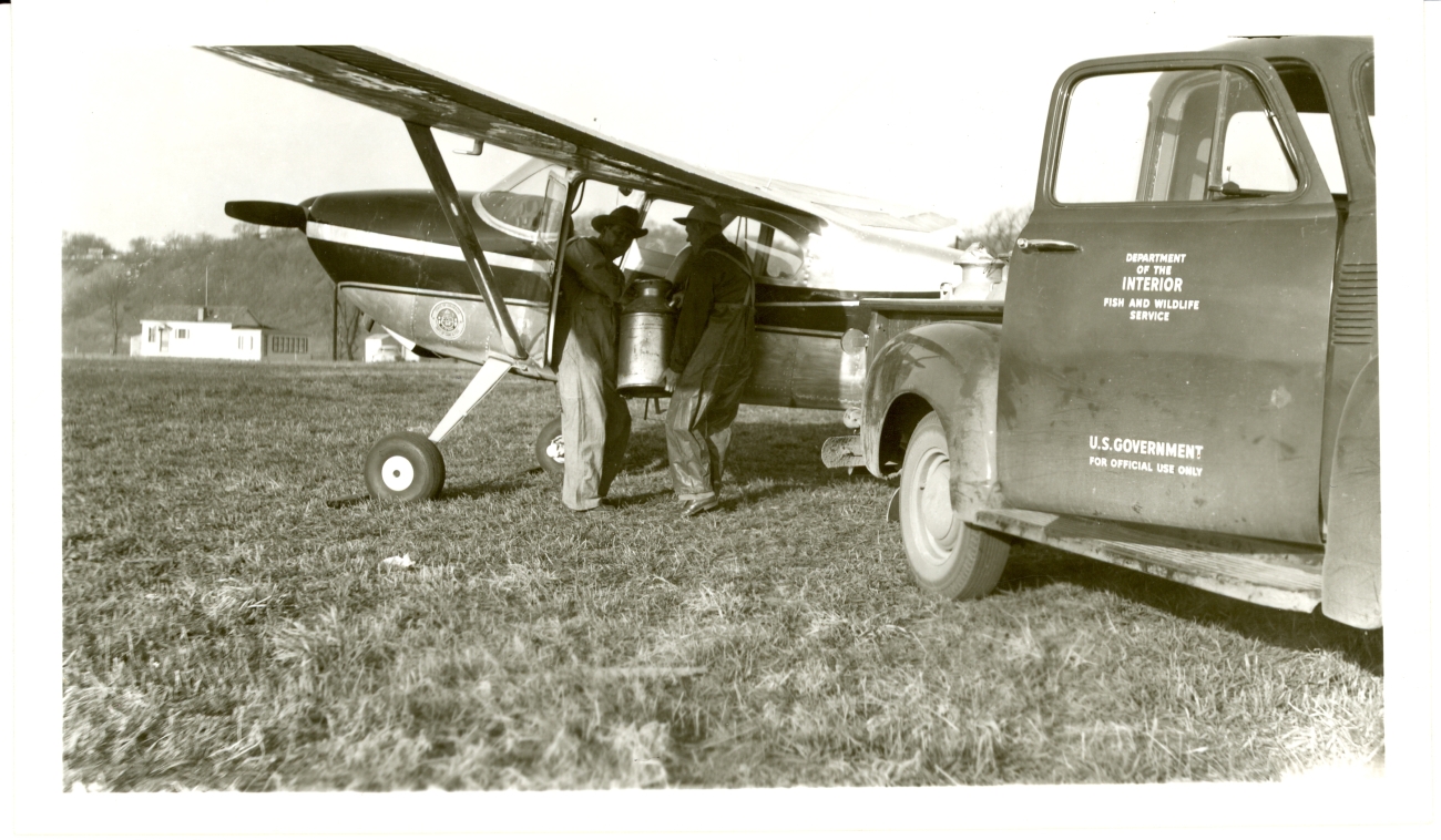 Transporting fish via small airplane by the former Guttenburg National Fish Hatchery (Iowa).