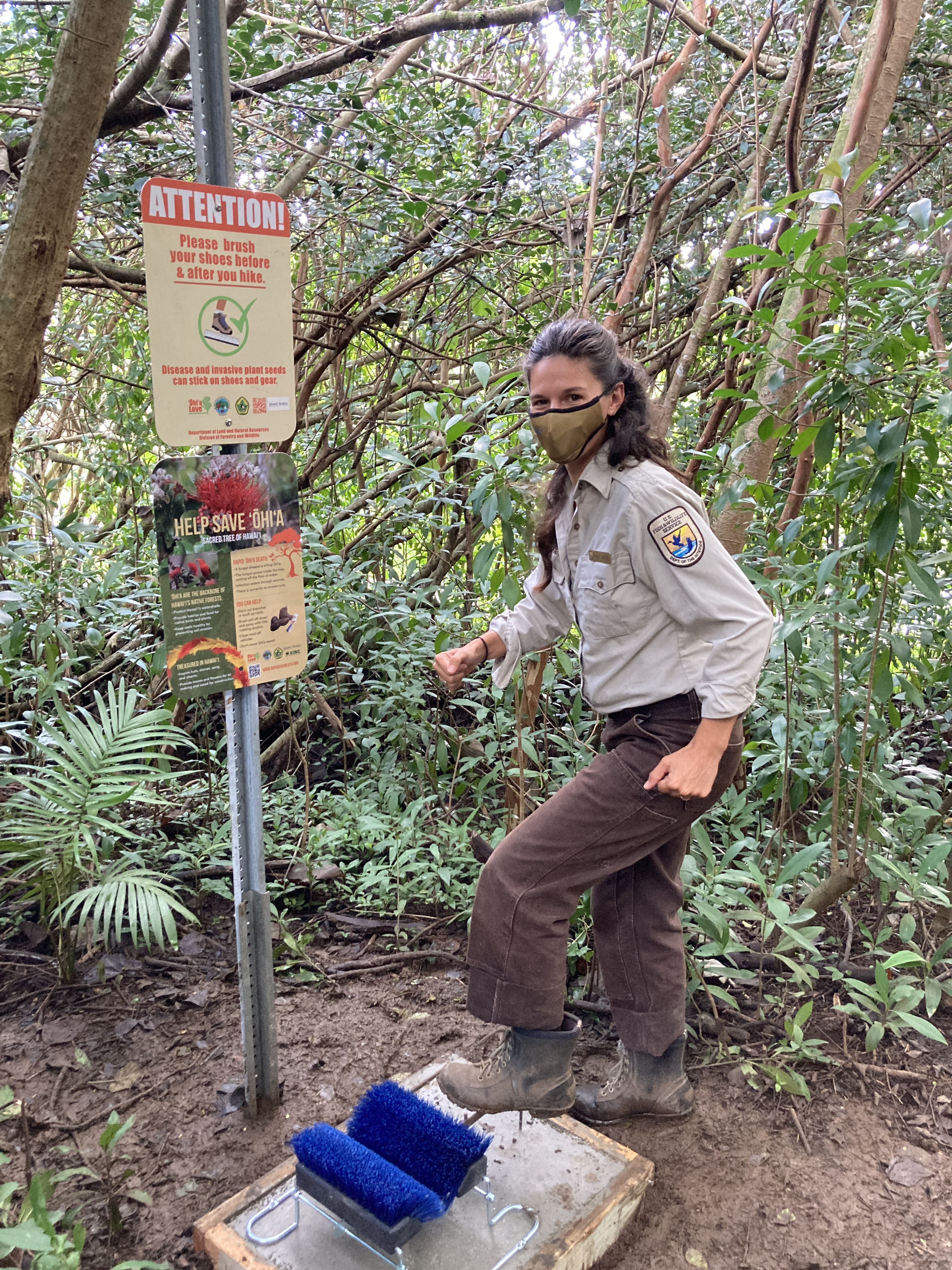 A park ranger scrubs her boots before hiking in an effort to prevent the spread of Rapid ʻōhiʻa Death.