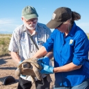 University of Cornell Herpetology Professor Emeritus Dr. Harry Greene hands Gertie the Bolson tortoise to U.S. Fish and Wildlife Service Director Martha Williams.