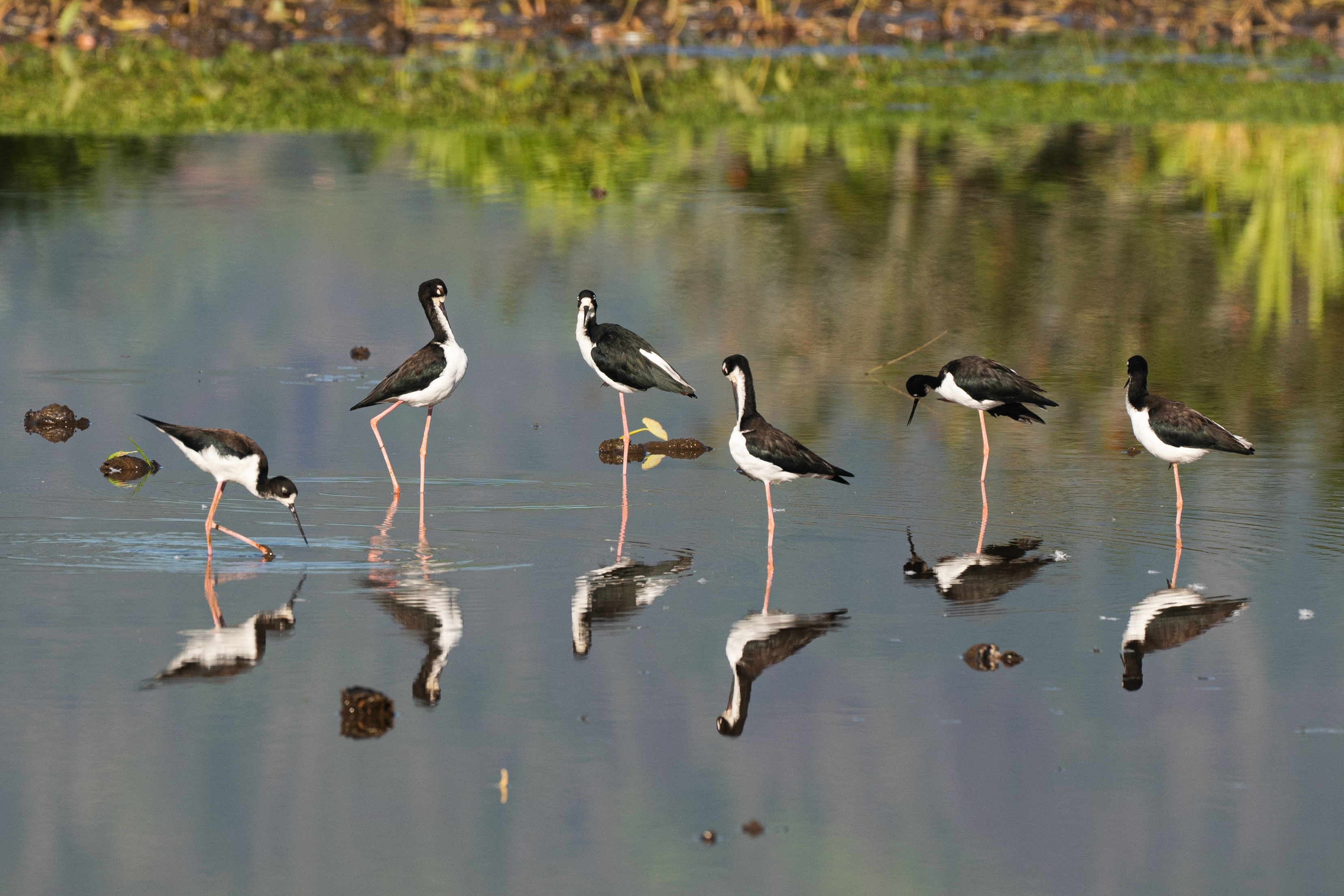 A group of Hawaiian stilts or ae’o and their reflections in a wetland at Kilauea Pond National Wildlife Refuge, one of the few freshwater wetlands found on the Hawaiian Islands.