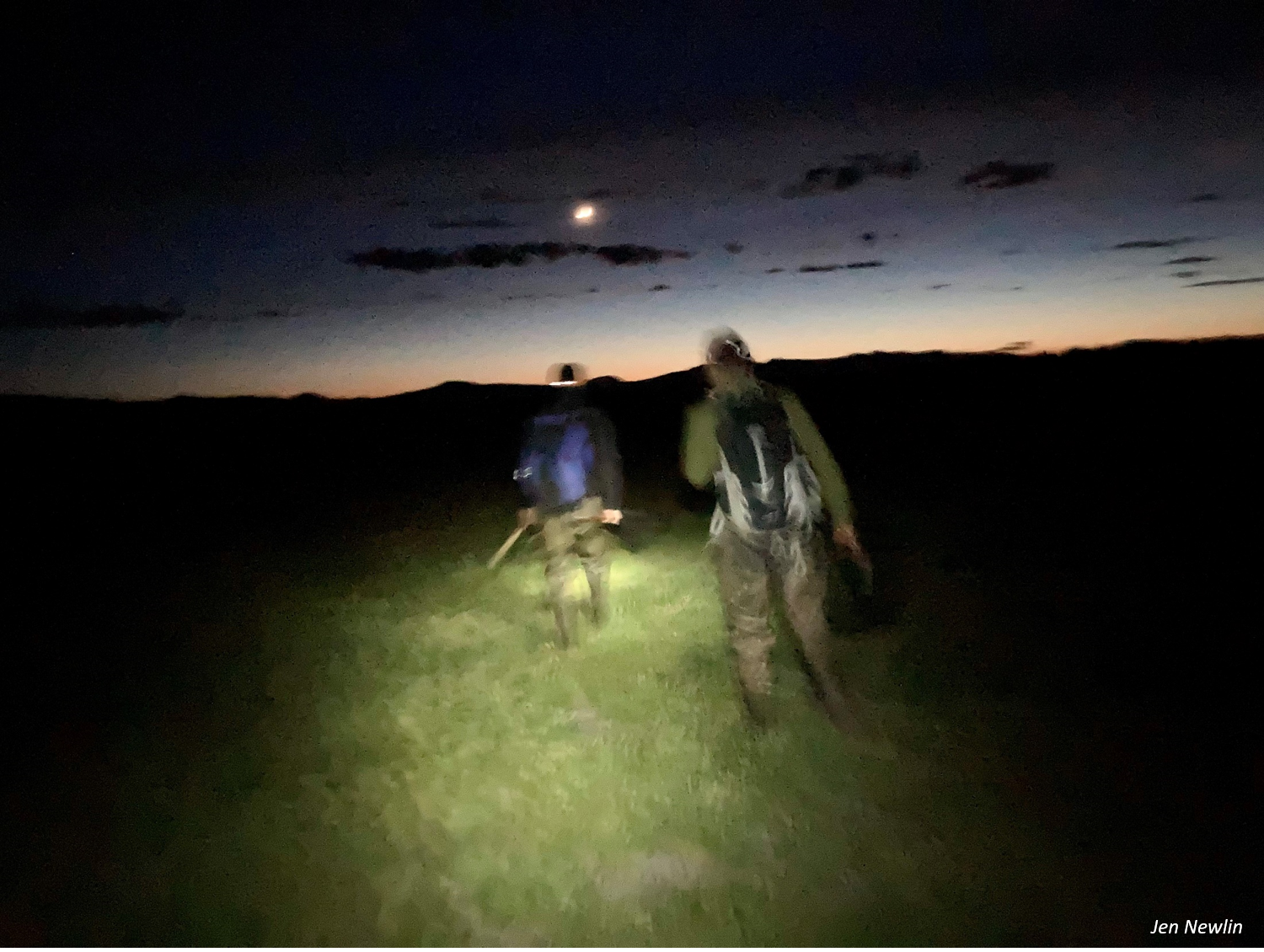 Two yellow rail researchers walk into Klamath Marsh National Wildlife Refuge at dusk.