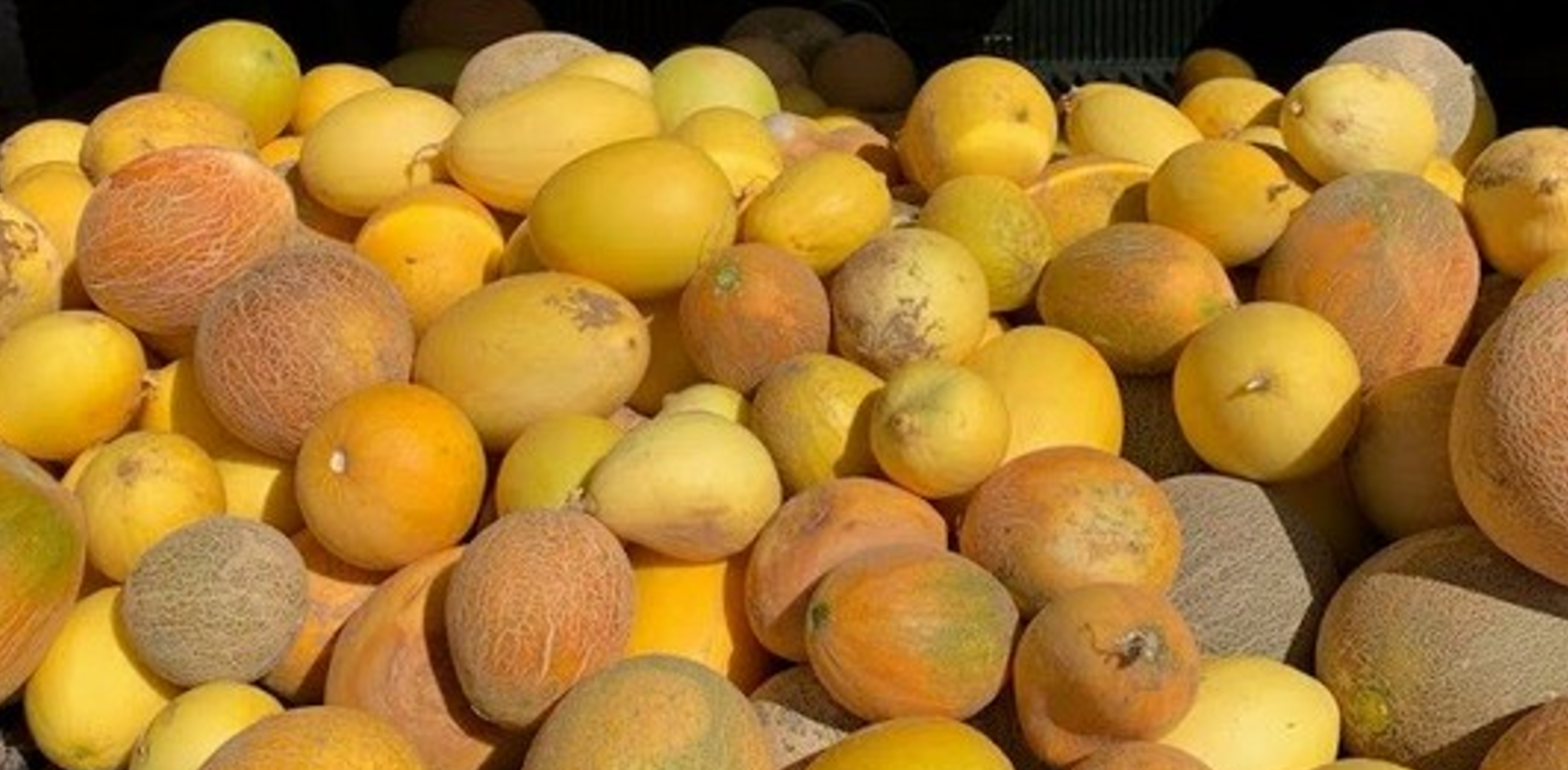 Heirloom melons of different sizes sit in the back of a truck for drop off by a farmer.