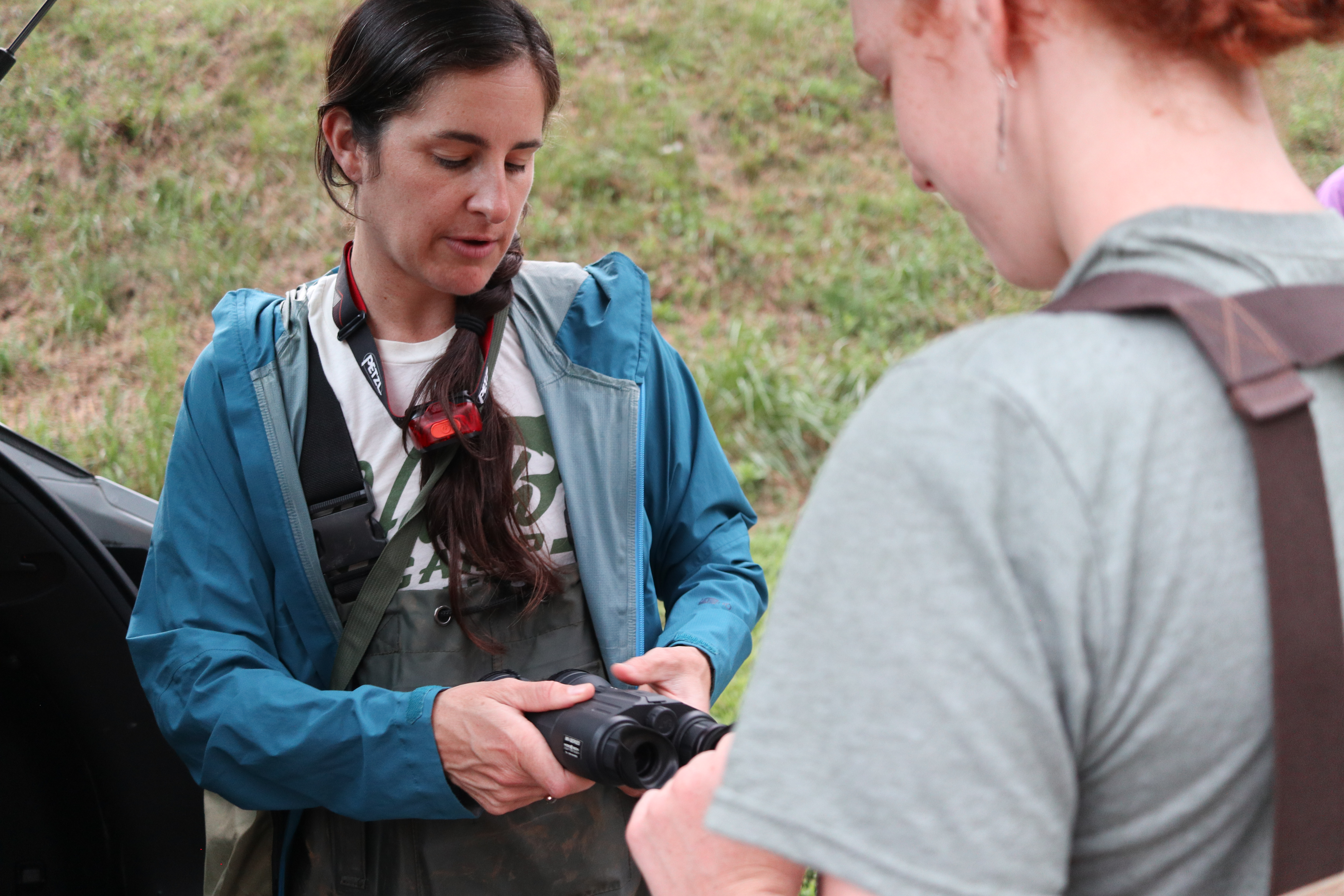Holland Youngman, US Fish and Wildlife Service, giving instruction on night-vision glasses to Sara Grace Dalton, NC Wildlife Resources Commission.