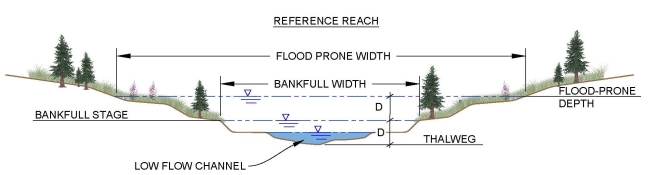 A cross section of a reference reach showing a bankfull channel and the adjacent floodplain. The flood prone depth and width is derived from a horizontal line drawn at times the maximum bankfull depth and the intersection of the natural terrain.