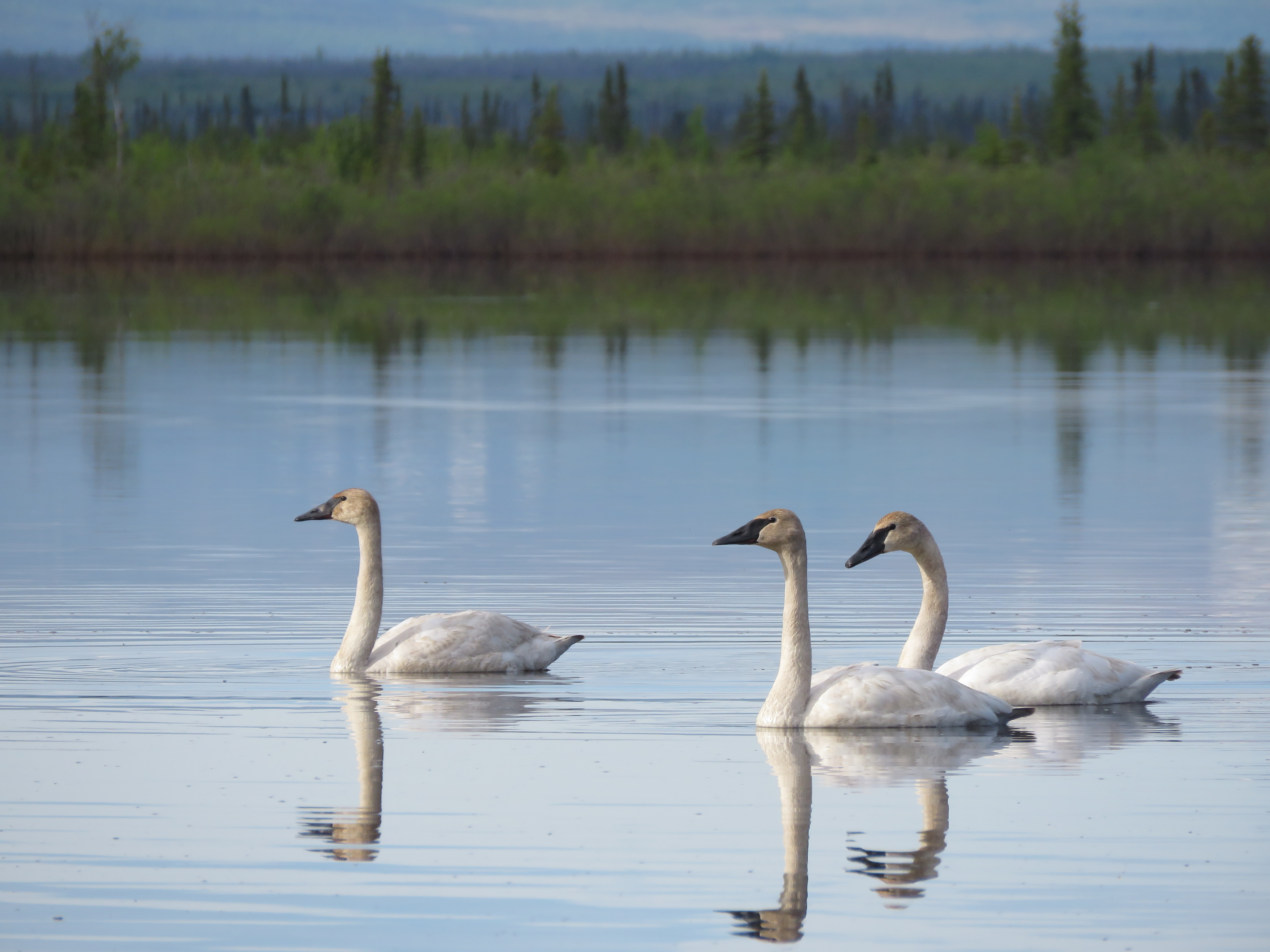 Three immature swans swim by at Kanuti National Wildlife Refuge in Alaska. Nearly 20 species of ducks historically have nested on or near the refuge. The most common breeders are the American Wigeon, Mallard, Northern Shoveler, Northern Pintail, Green-winged Teal, and Scaup. Both Tundra and Trumpeter Swans breed in the refuge. Greater White-fronted and Canada Geese breed near riparian corridors.