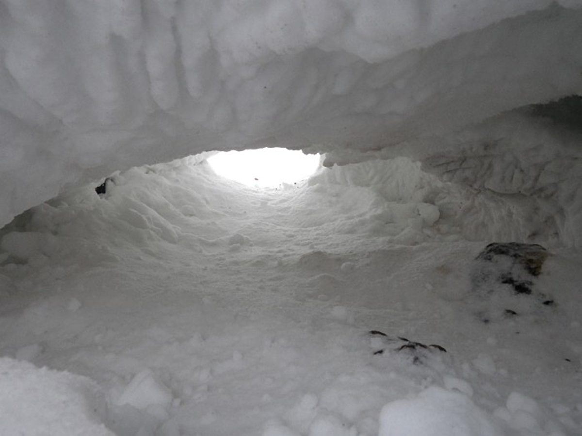 View from inside an empty polar bear den, showing a cave of snow and a hole at the entrance.