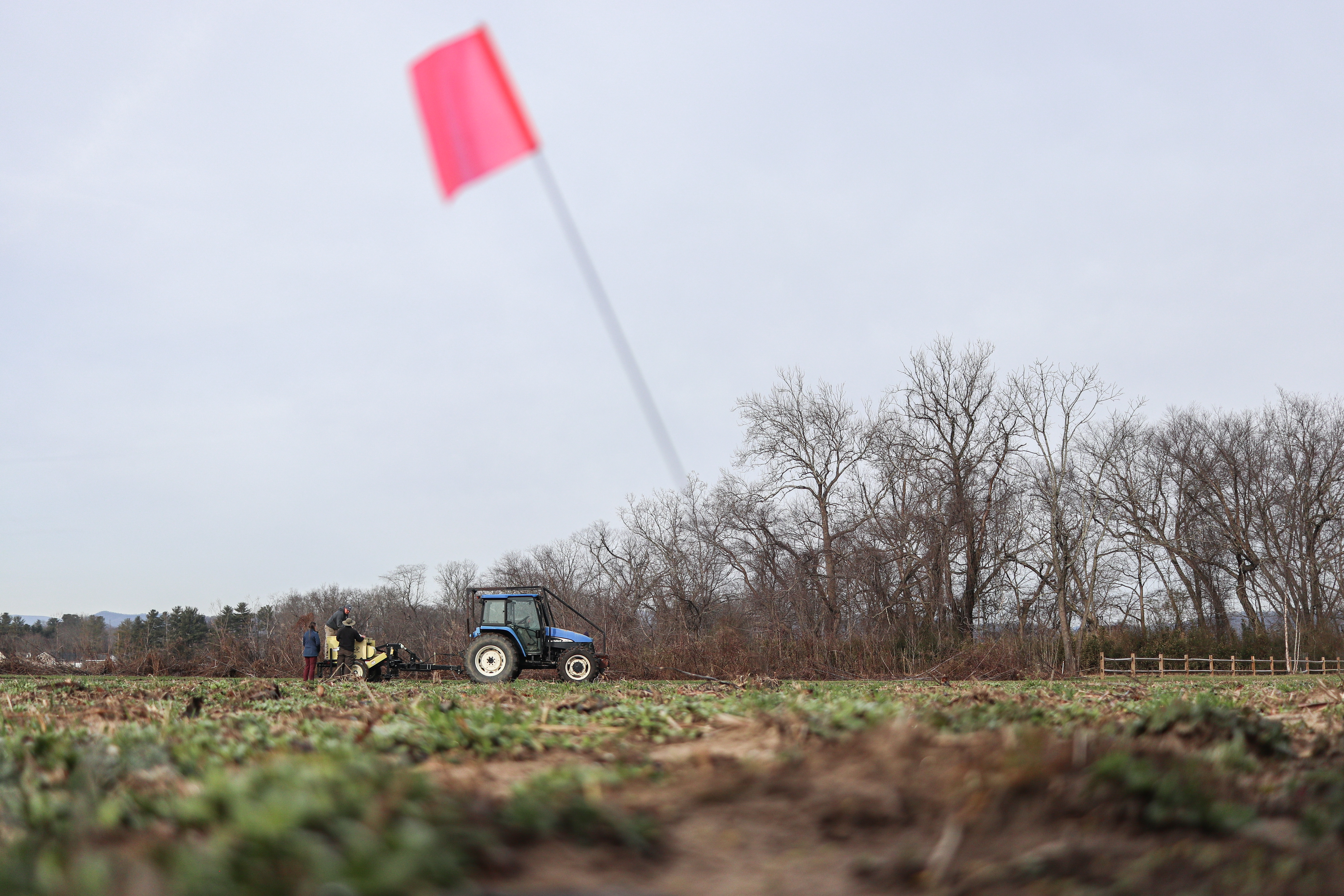 Nicole Sweat, Wes Humphries, and Bryan Tompkins inspect the seed drill before planting the pollinator meadow at Mills River Park, Mills River, N.C.