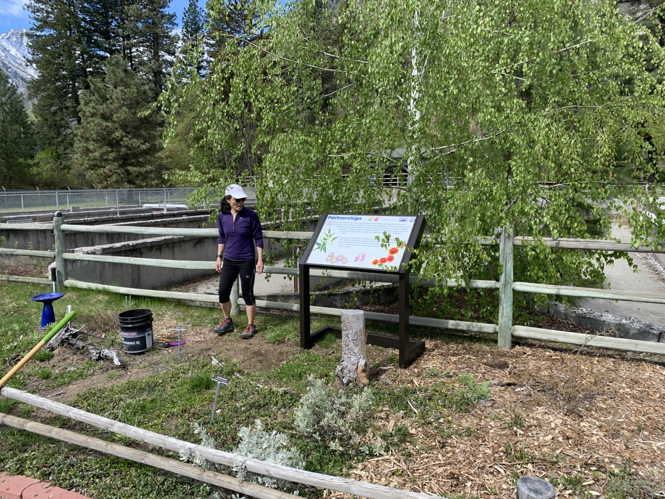 Susie Stenkamp of the WSU Chelan Douglas Master Gardeners installs a sign in the the pollinator garden at Leavenworth National Fish Hatchery.