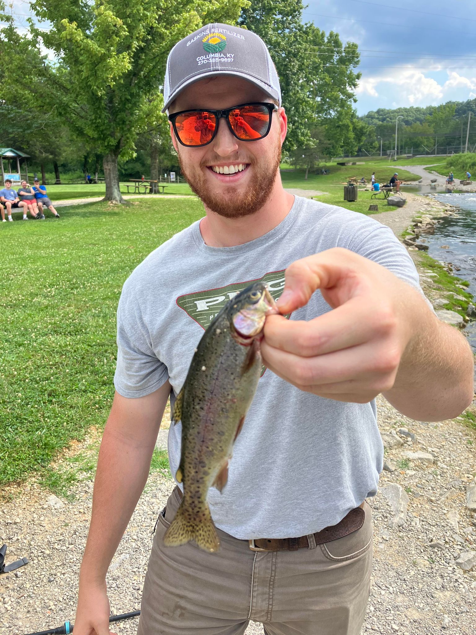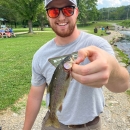 Jacob Foster, a participant of the Fly Fishing 101 workshop held at Wolf Creek National Fish Hatchery, poses with his first fish caught on a fly rod!