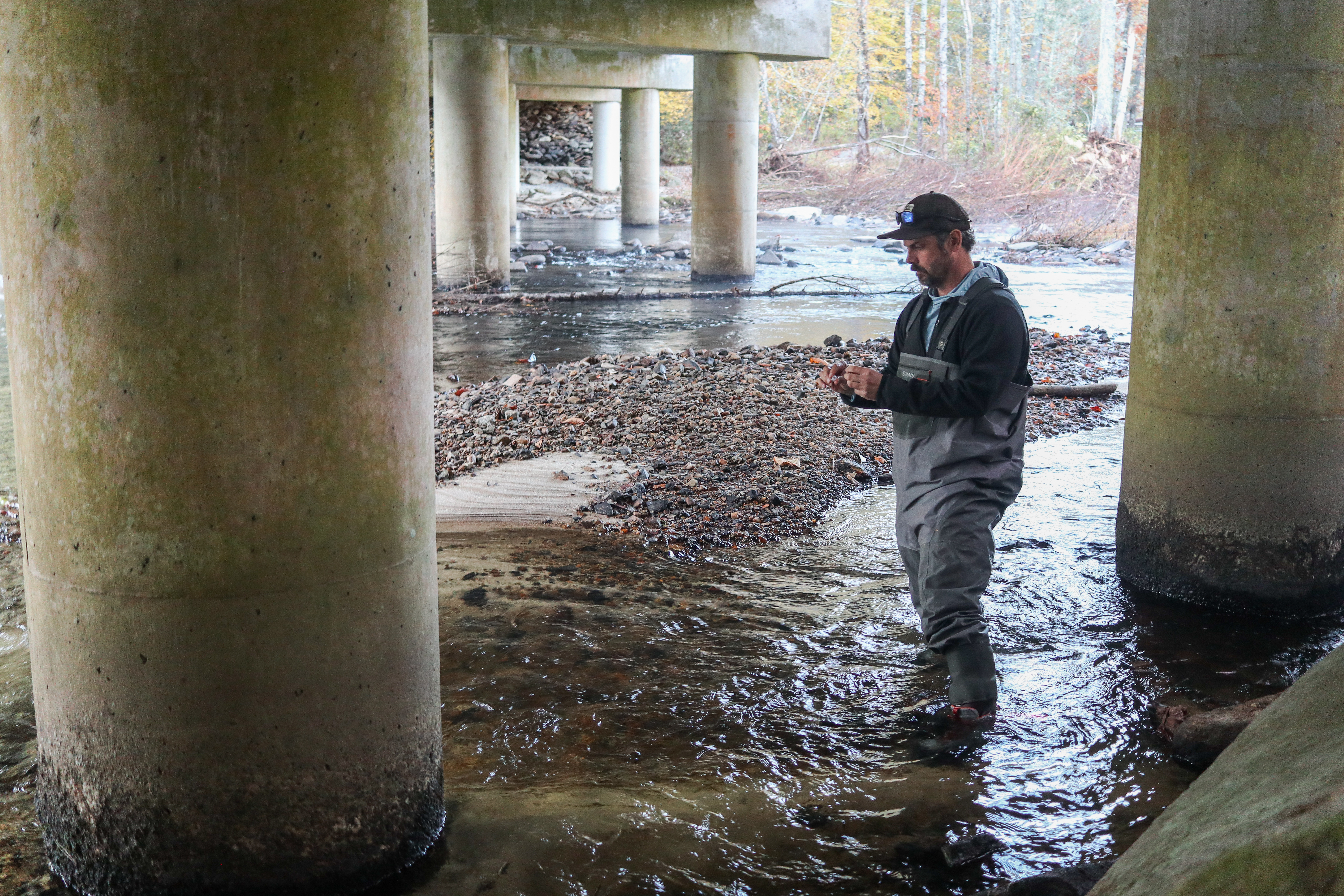 Jay Mays, US Fish and Wildlife Service, takes a water sample from the LIttle River. Transylvania County, NC.