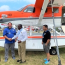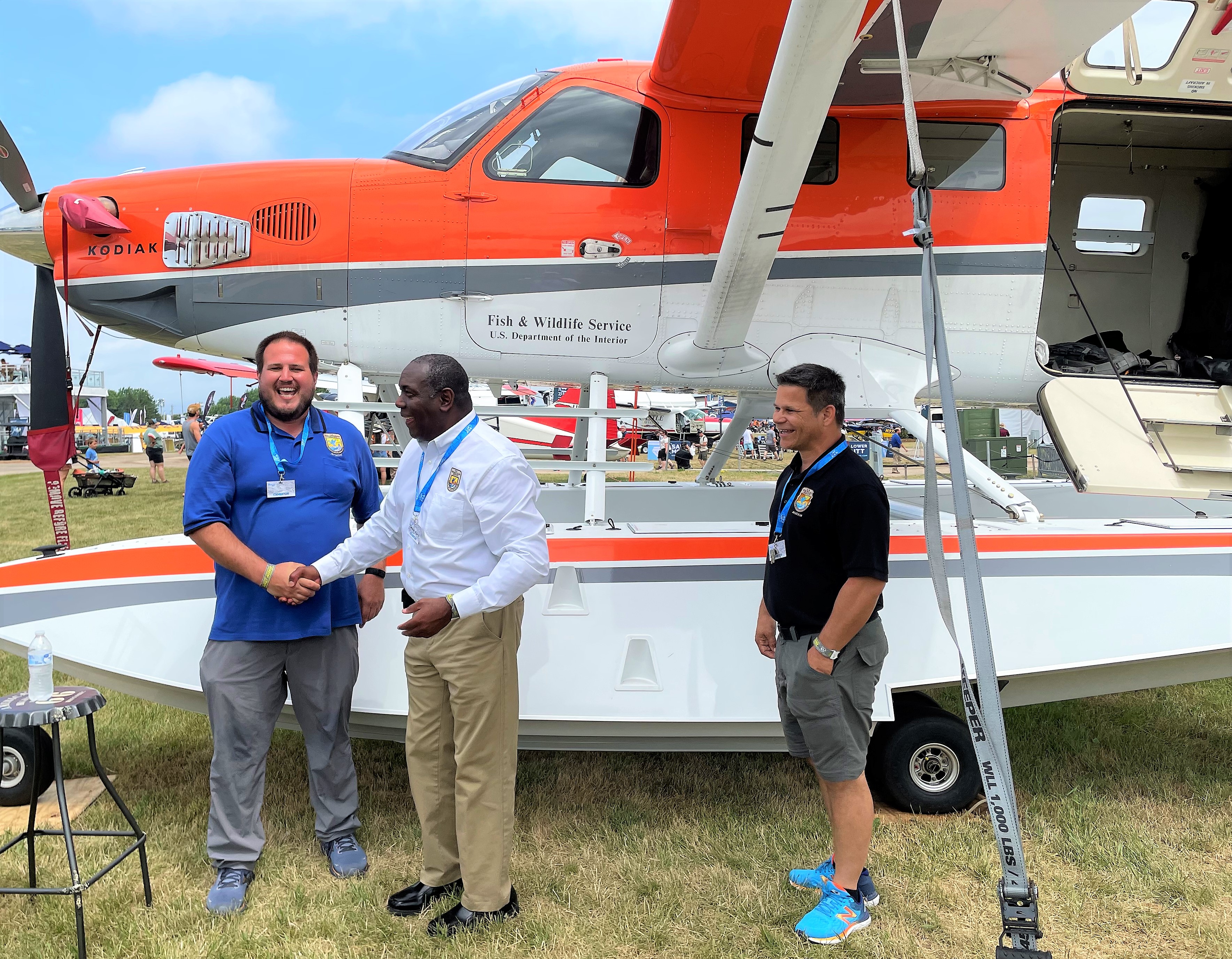 Pilot Biologist Garrett Wilkerson and Assistant Director of the Migratory Birds Program Jerome Ford shaking hands and smiling by the survey plane with UAS Program Manager Scott Bishaw