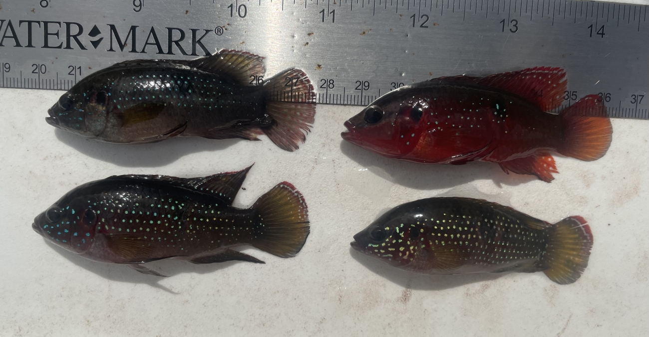 Display of color patterns between African jewelfish (Hemichromis bimaculatus) collected during early detection surveys.