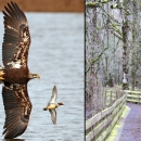 A juvenile bald eagle and a green-winged teal duck share airspace at Ankeny National Wildlife Refuge, one of three refuges between Salem and Eugene, Oregon. Both photos were taken in late winter.
