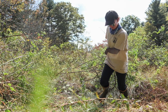 Karla Quast, administrative officer for the Asheville Field Office, clears downed brush from the bog.