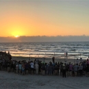 People gathered on the beach at dawn for a public Kemp's ridley hatchling release.