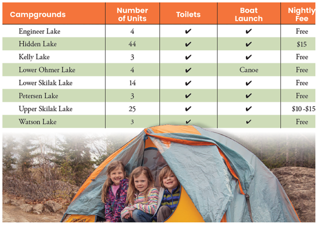 Kenai NWR Campground information with campground name, number of units, toilets, boat launch, and nightly fees.