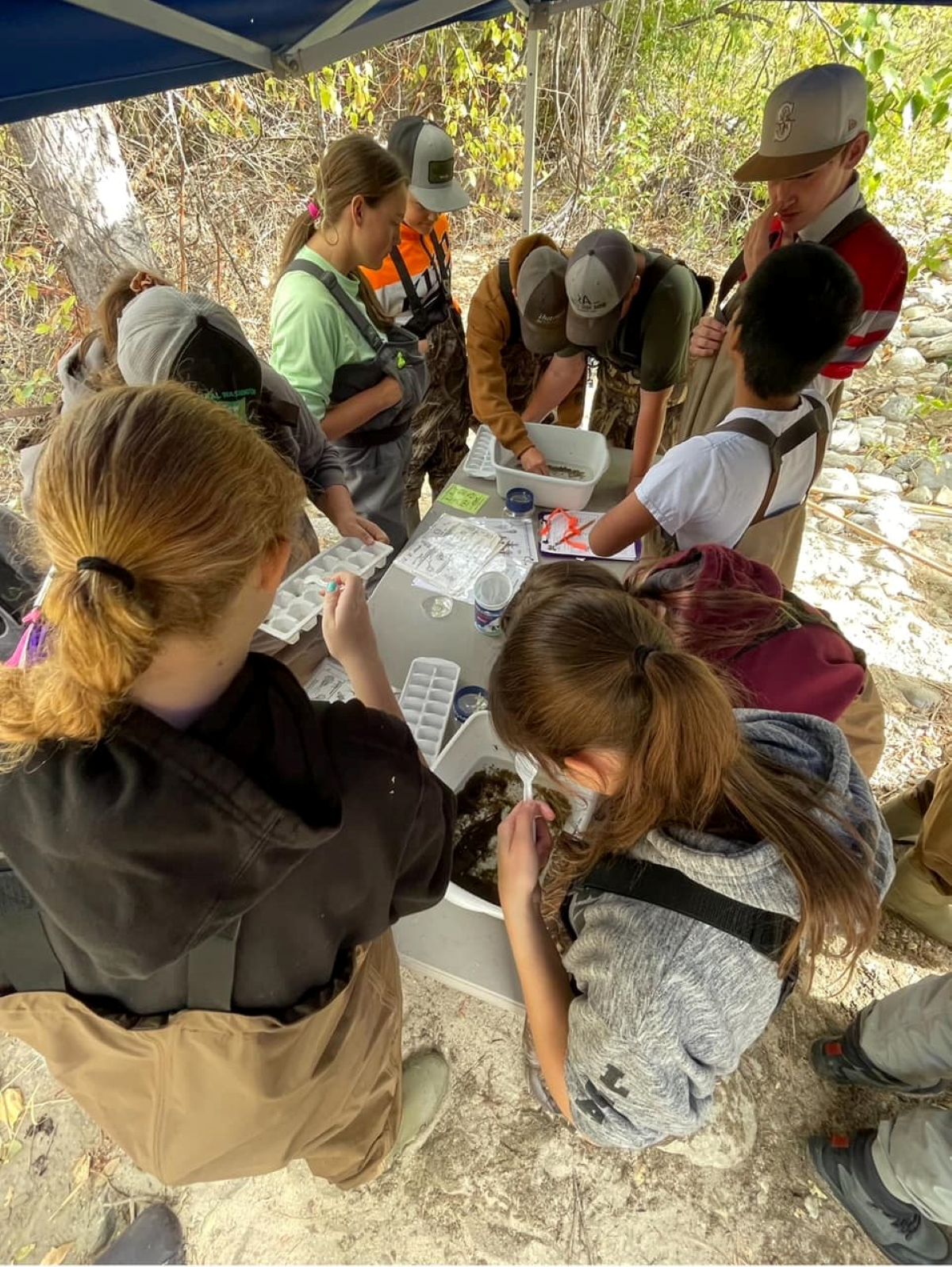 Students sort and identify the macroinvertebrates collected in the river