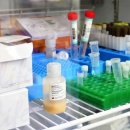 Lab vials and bottles in freezer at the Whitney Genetics Lab