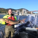 New Columbia FWCO biologist Kellie Hanser celebrating a lake sturgeon capture.