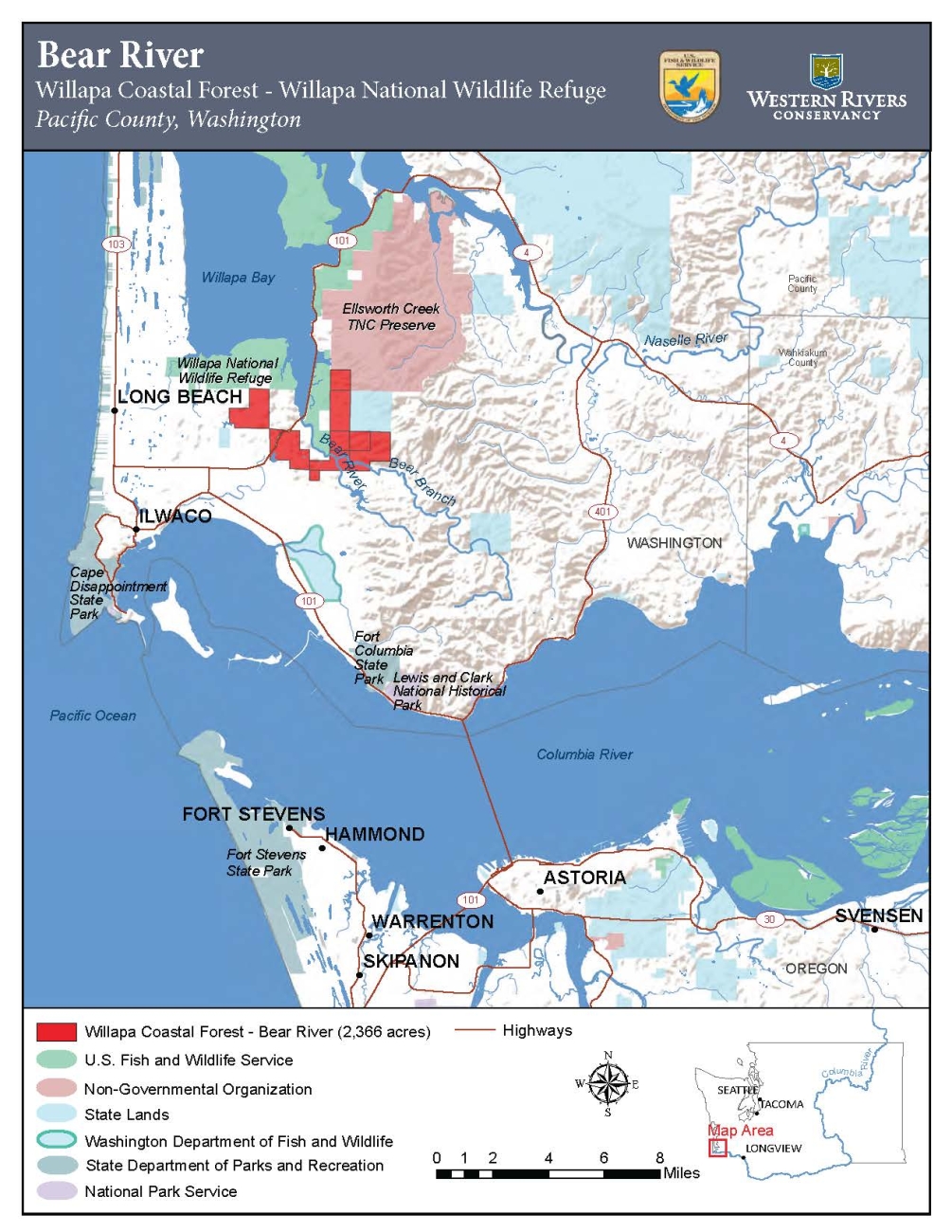 Lands in red are newly acquired and part of Willapa National Wildlife Refuge