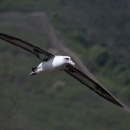 A Laysan albatross (mōlī) soars over a section of predator exclusion fence on Nihokū at Kīlauea Point National Refuge. Nihokū and Mokolea Point are ideal nesting locations for seabirds because the hills and plateaus within this portion of the refuge rest on the northern coastline where seabirds like this Laysan albatross can easily land and take off.