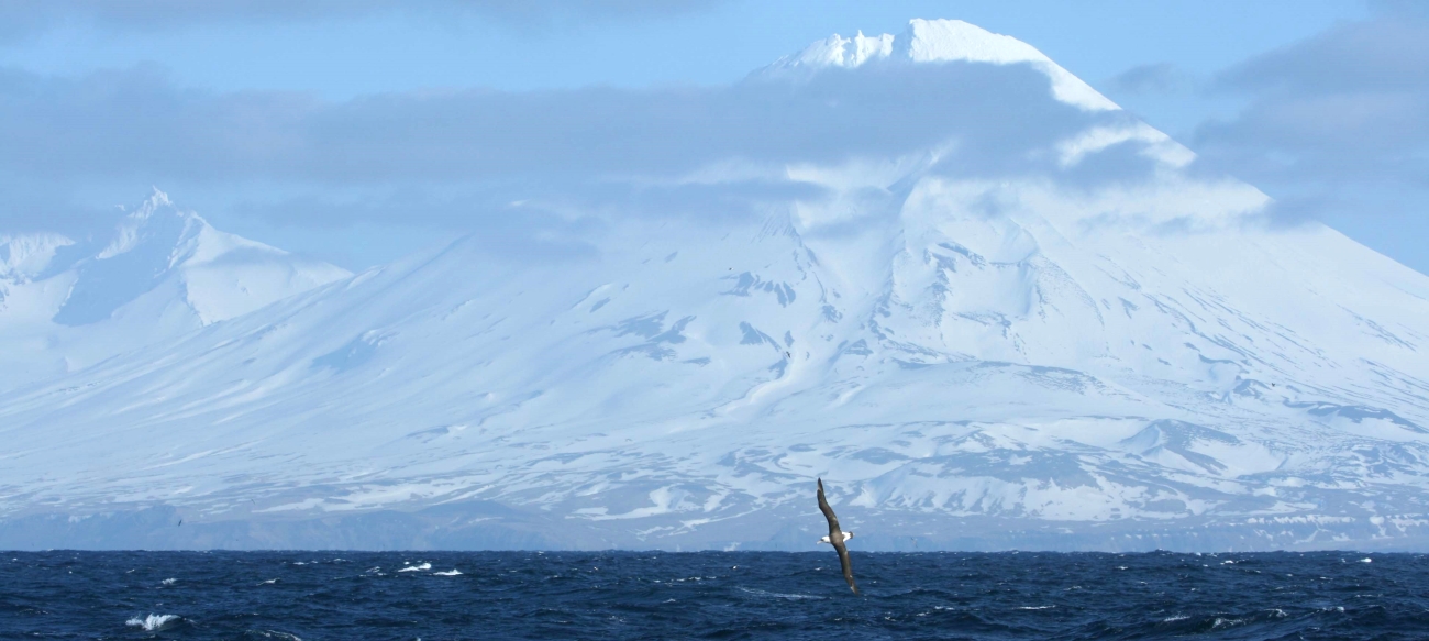 A Laysan Albatross flies over sea with Mt.Vesvidof/Umnak Island in the background.