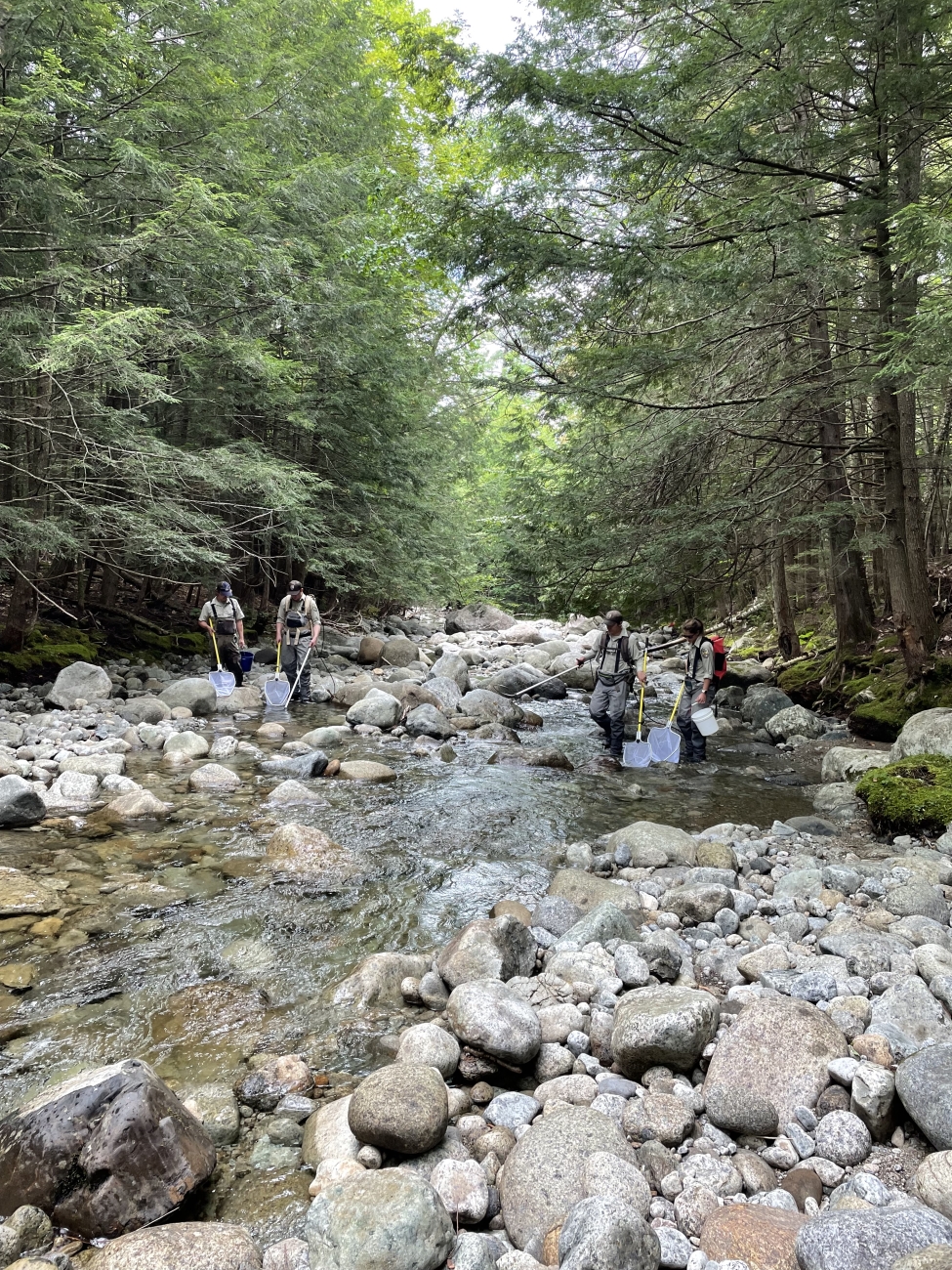 Field crew assessing juvenile Atlantic salmon in the headwaters of the Boquet River, 2021