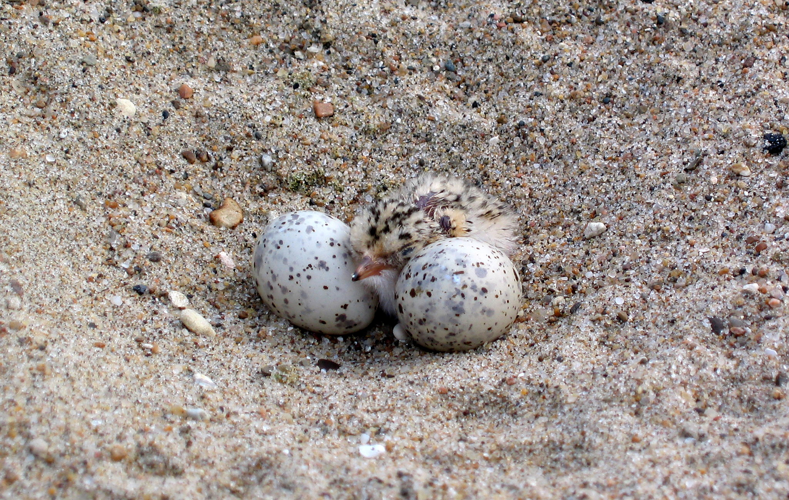 Least tern chicks leave the nest just days after hatching, but adults will continue to care for them by leading them to shelter in nearby grasses and bringing them food..