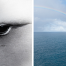 On the left is a close-up of the mōlī (Laysan albatross) eye and on the right is an ‘iwa (great frigatebird) soaring over a rainbow. Photo Credit: Laurel Smith/USFWS