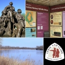 Clockwise from top left: Lewis and Clark sculpture in Kansas City, Missouri; DeSoto National Wildlife Refuge information kiosk in Iowa; trail logo; and Missouri River. (various dates)