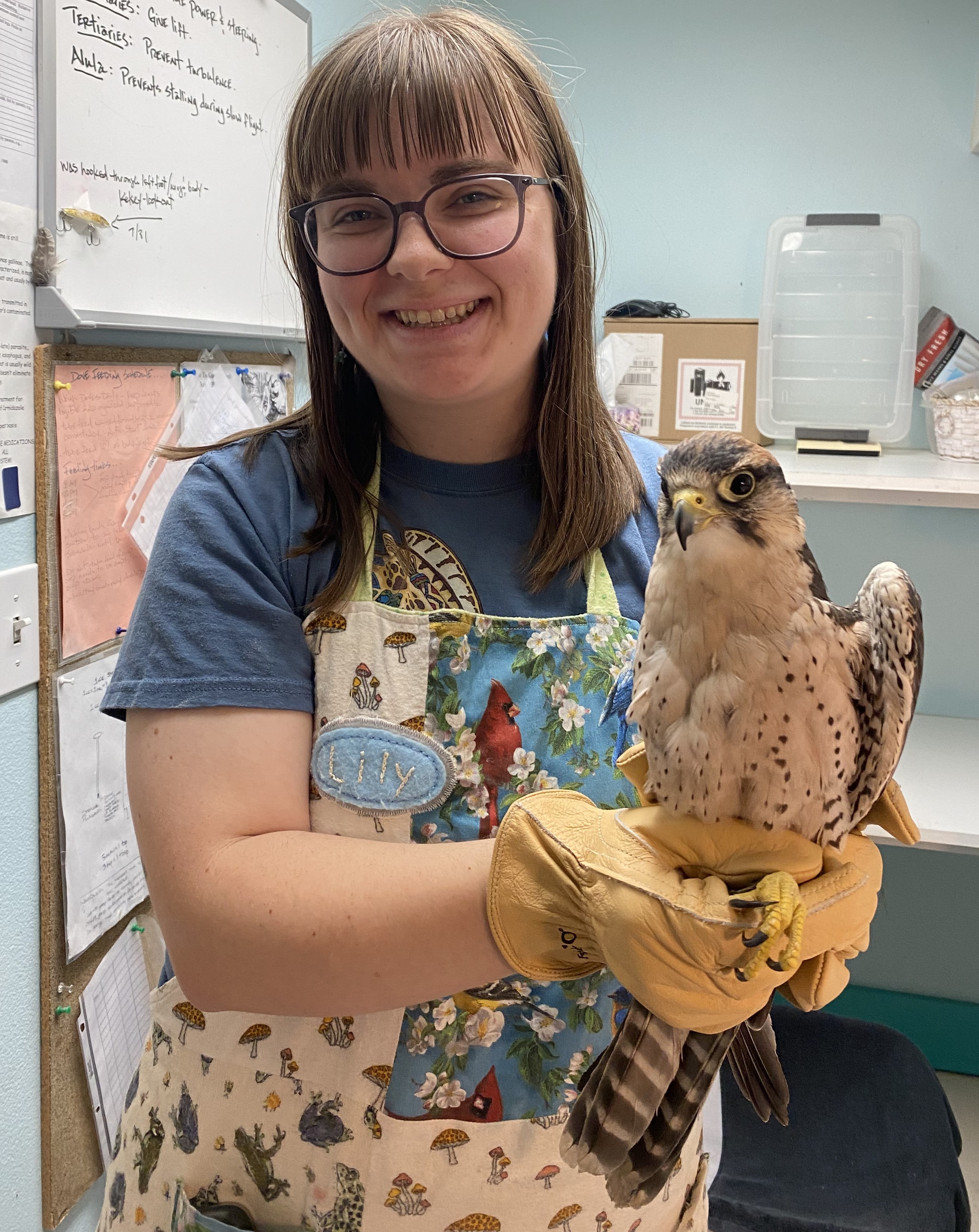 Lily Hodgson holding a lanner falcon in the Ruth Melichar Bird Center in Boise, Idaho. While not native to North America, lanner falcons are used in falconry. Luckily the bird was uninjured when found, and Lily was able to reunite it with its owners.