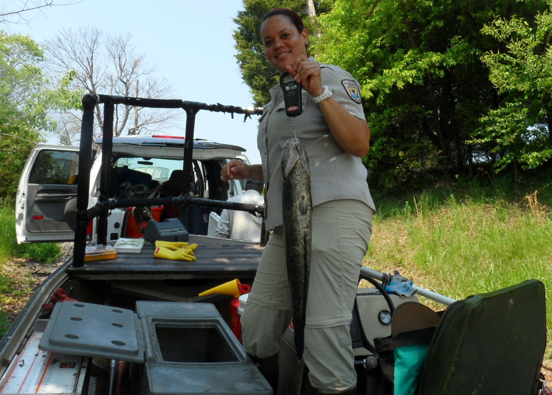 Lisa weighs northern snakehead she shocked up in Quantico Creek in Dumfries, VA