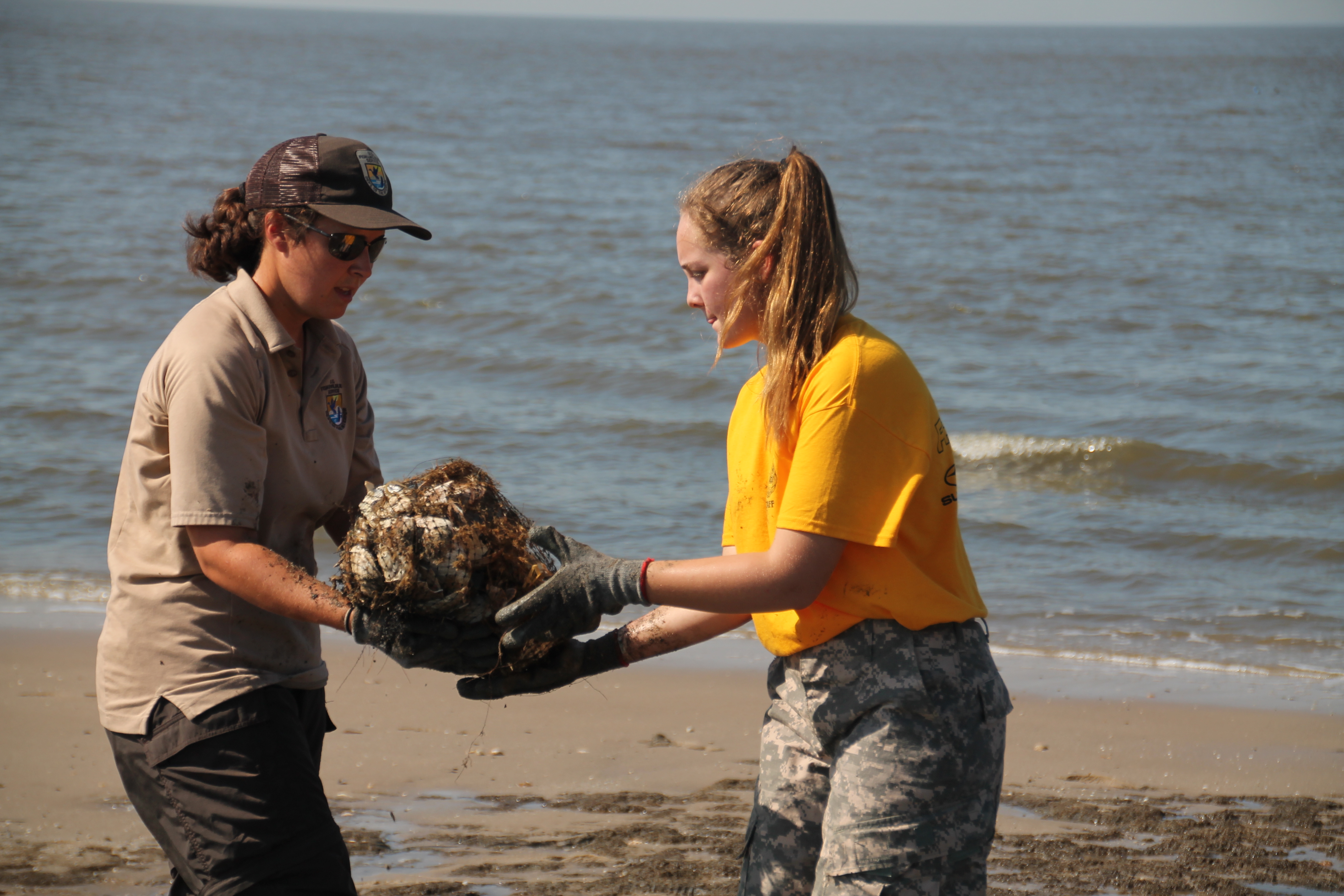 During living shoreline construction, shell bag materials were passed hand-to-hand from the staging area to the reef location.