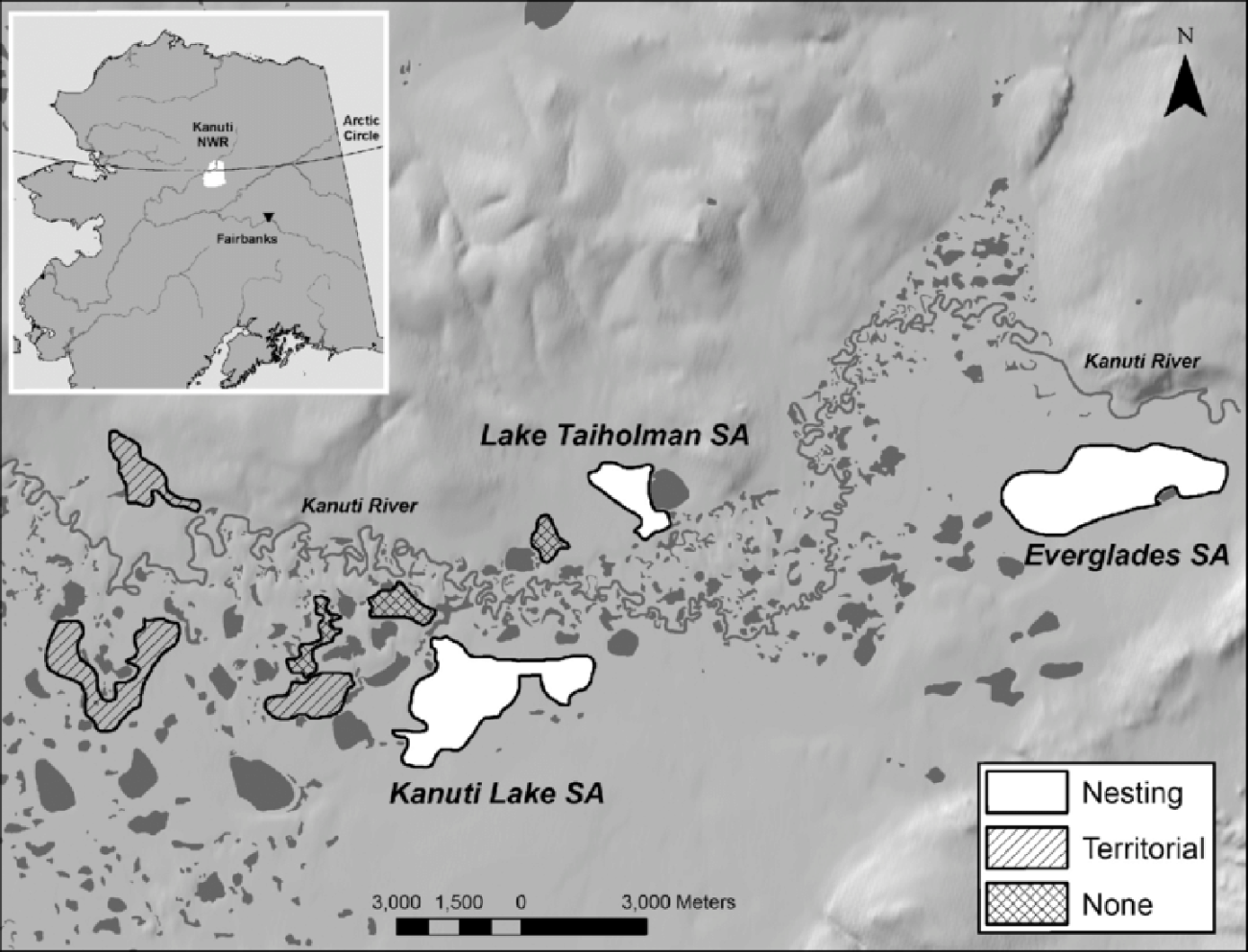 Figure 1. Location of the study areas comprising nine tundra patches searched for Whimbrels within the Kanuti National Wildlife Refuge, Alaska, during 2008-2014. The legend depicts the assessment of occupancy or breeding status documented for each patch, with the major study areas indicated (SA).