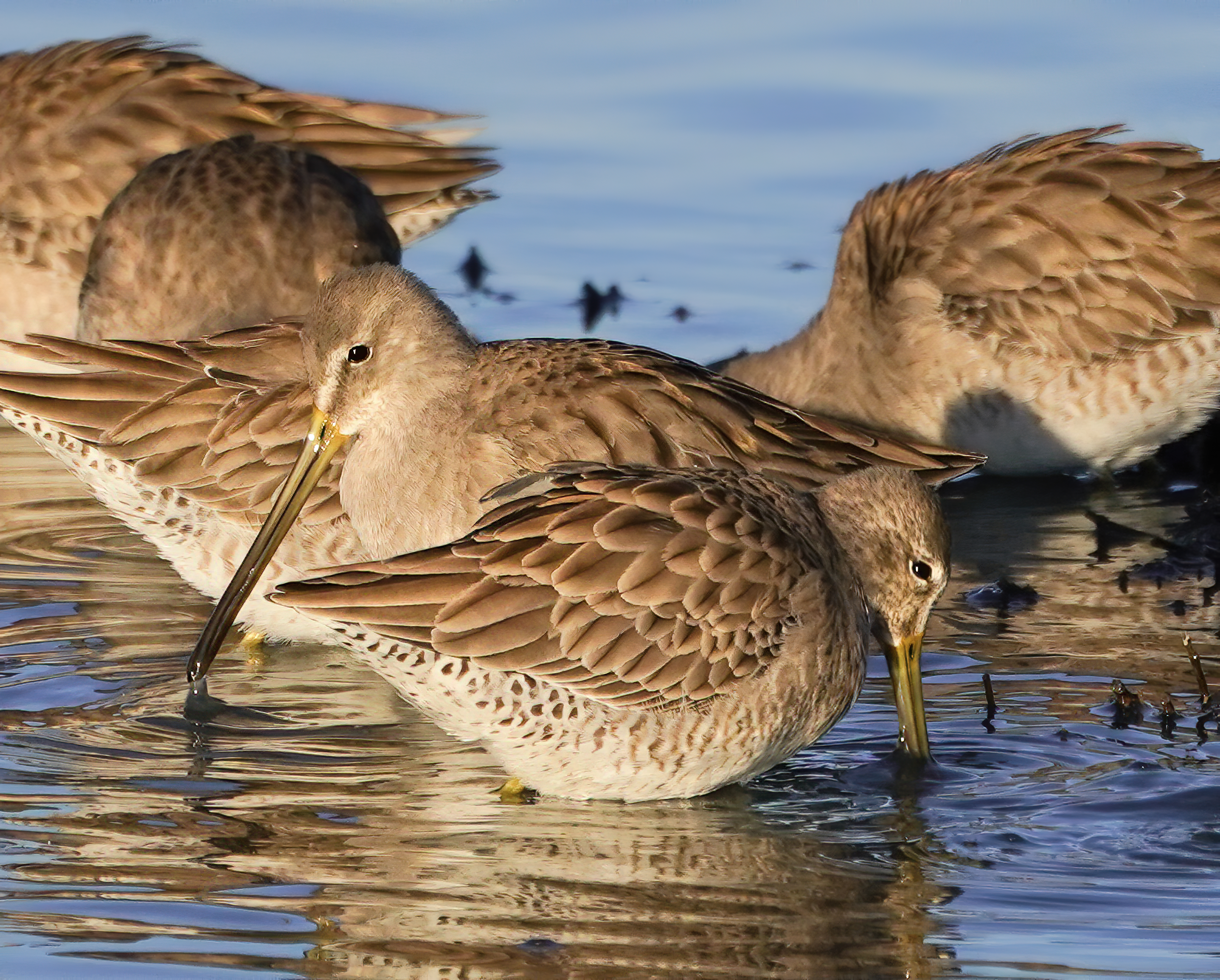 Long-billed dowitchers foraging in a wetland at the Merced National Wildlife Refuge in California. © James Sanderson