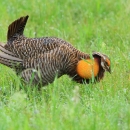 A male Attwater’s prairie chicken inflates his yellow air sacks while he dances and booms as part of his mating ritual.