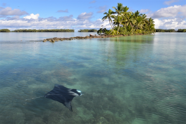 A manta ray swims by one of Palmyra Atoll's small islands, covered with palm trees soon to be restored with native species of plants