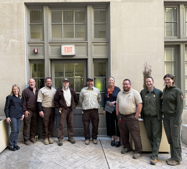 Pictured Left to Right: Joelle Gehring, Dave Miller, Darren Stover, Martin Brockman, Chuck Henschel, Martha Williams, Matt Boarman, Leslie Frattaroli, and Elizabeth Rush stand in front of one of the bird-safe demonstration doorways at the Stewart Lee Udall Building.
