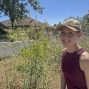 Mary Teague sitting next to a flowering native narrow leaf milkweed (Asclepias fascicularis) in her front yard. Credit: Mary Teague/USFWS
