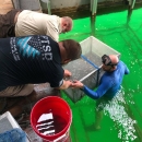 Staff from Erwin National Fish Hatchery and Dale Hollow National Fish Hatchery work to install freshwater mussel cages into suspending racks in Dale Hollow Lake.