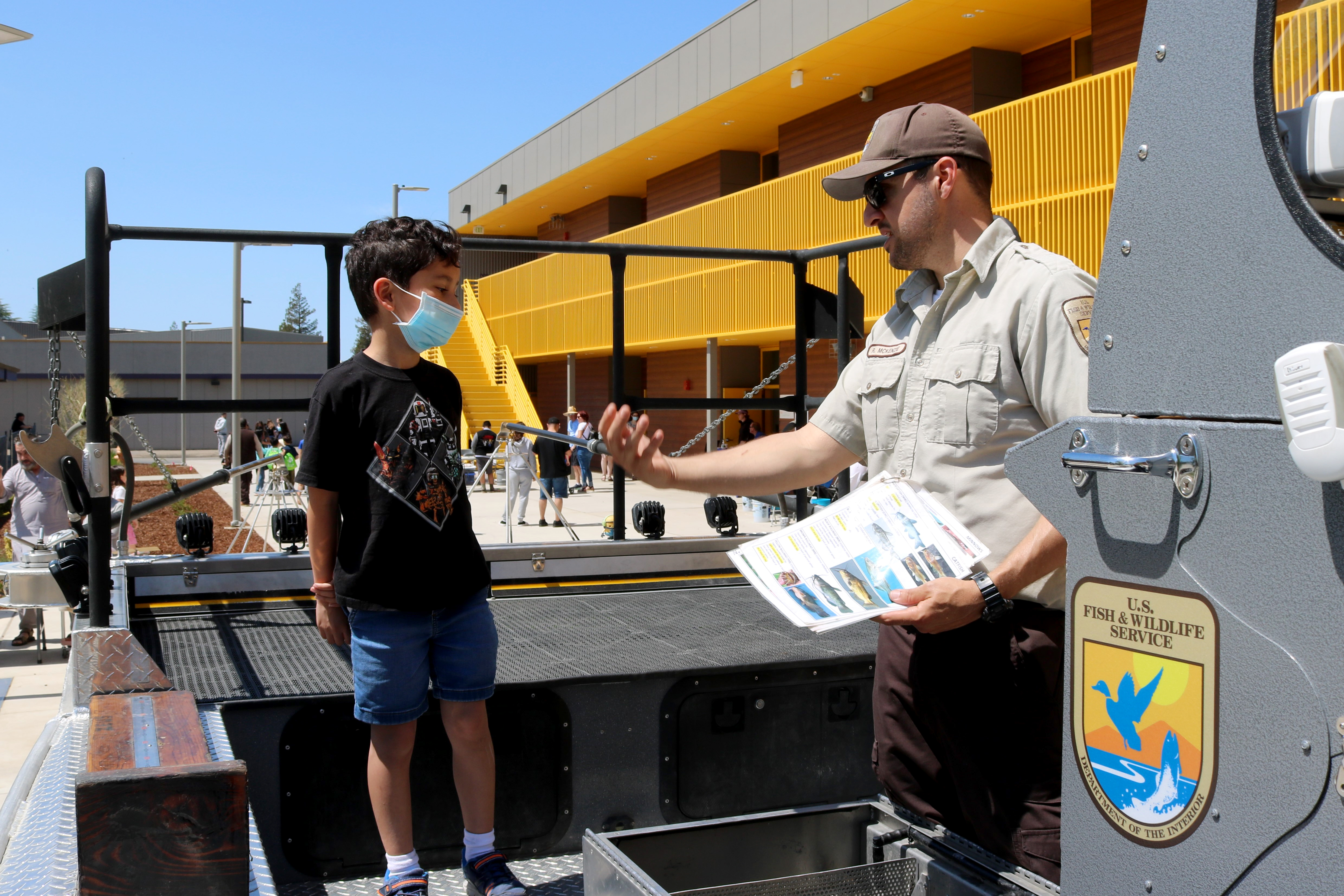 Marcus Estremera, 7, learns about fish of the Sacramento-San Joaquin River Delta from fish biologist Ryan McKenzie during the NorCal Science Festival at Tokay High School in Lodi, California, on April 23, 2022.