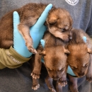 A biologist holds three Mexican wolf pups.