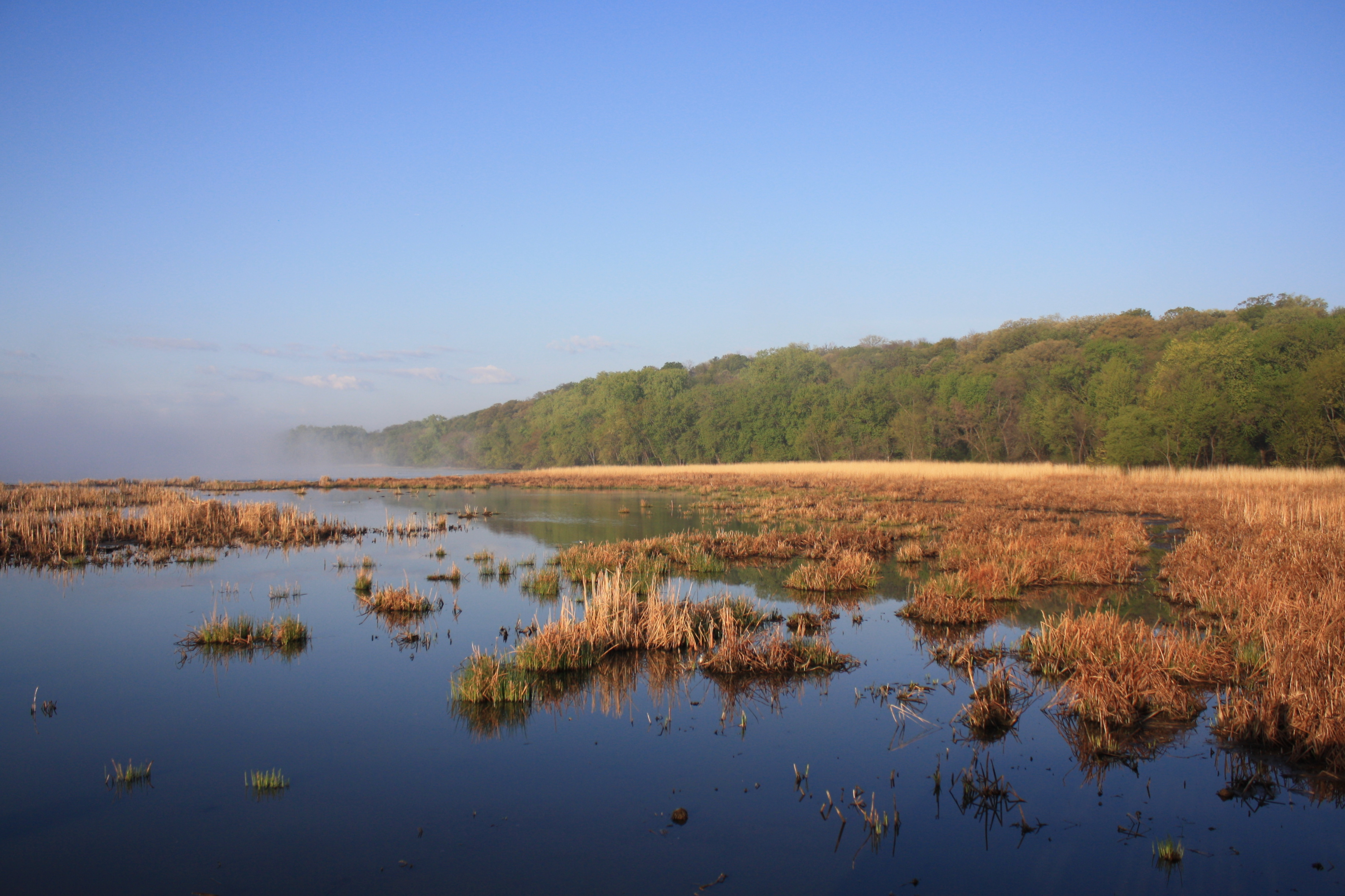 Minnesota River with brown marsh grasses at Minnesota Valley National Wildlife Refuge.