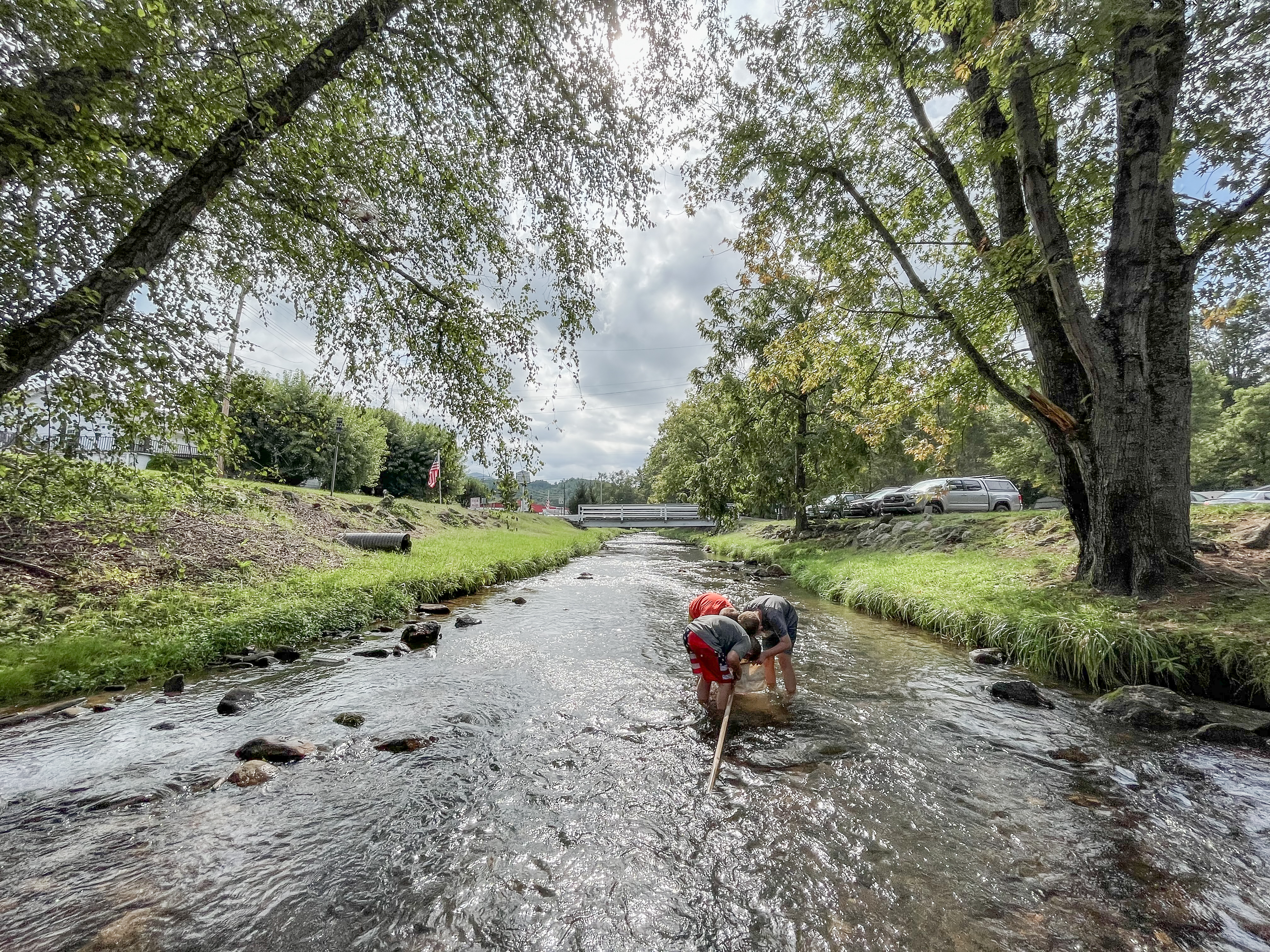 Mitchell County, N.C. students search for aquatic invertebrates in Cane Creek as part of the 2023 Toes in the Toe educational event.