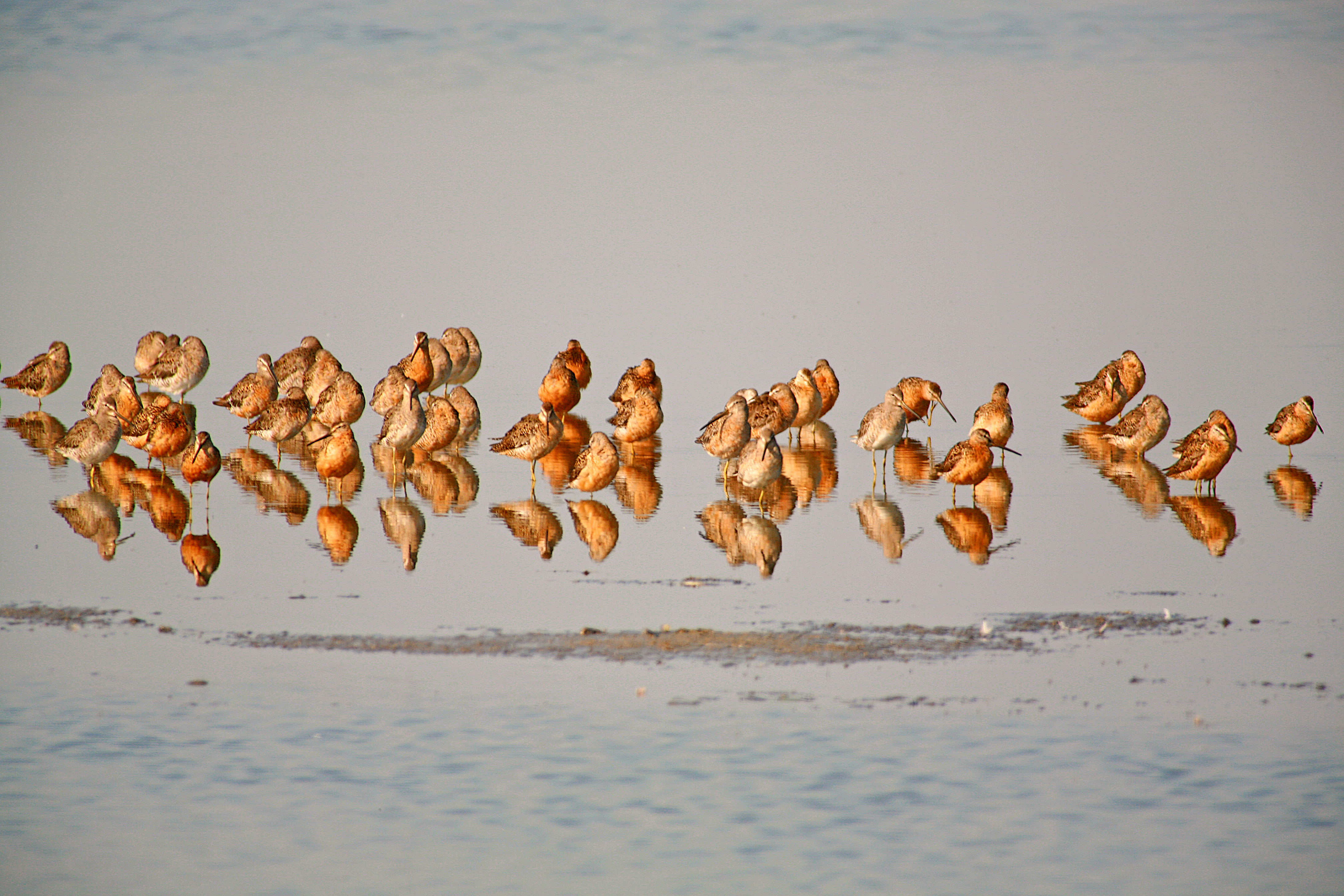 A flock of dowitchers wading in shallow water at Kellys Slough NWR
