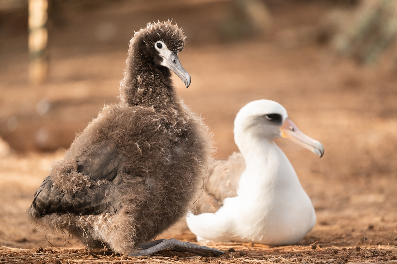 Mōlī (Laysan alabatross), right, with its young at Kilauea Point National Wildlife Refuge. A successful Laysan pair produces just one egg per season. Chicks fledge five to six months after hatching.