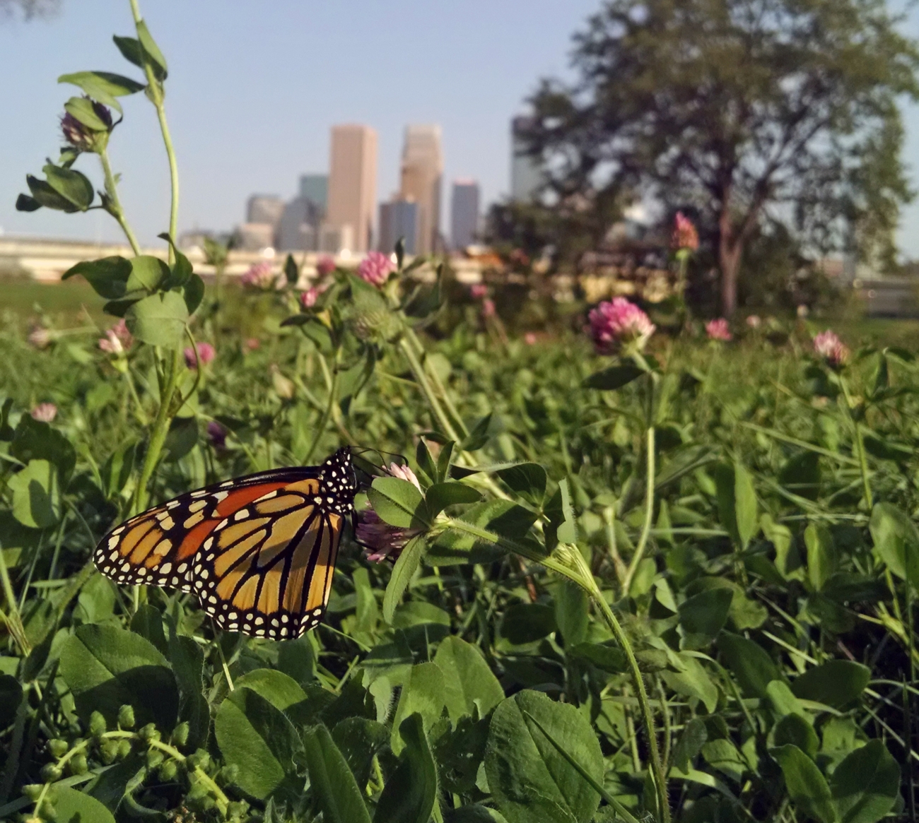 A monarch butterfly on blooming purple clover near downtown Minneapolis