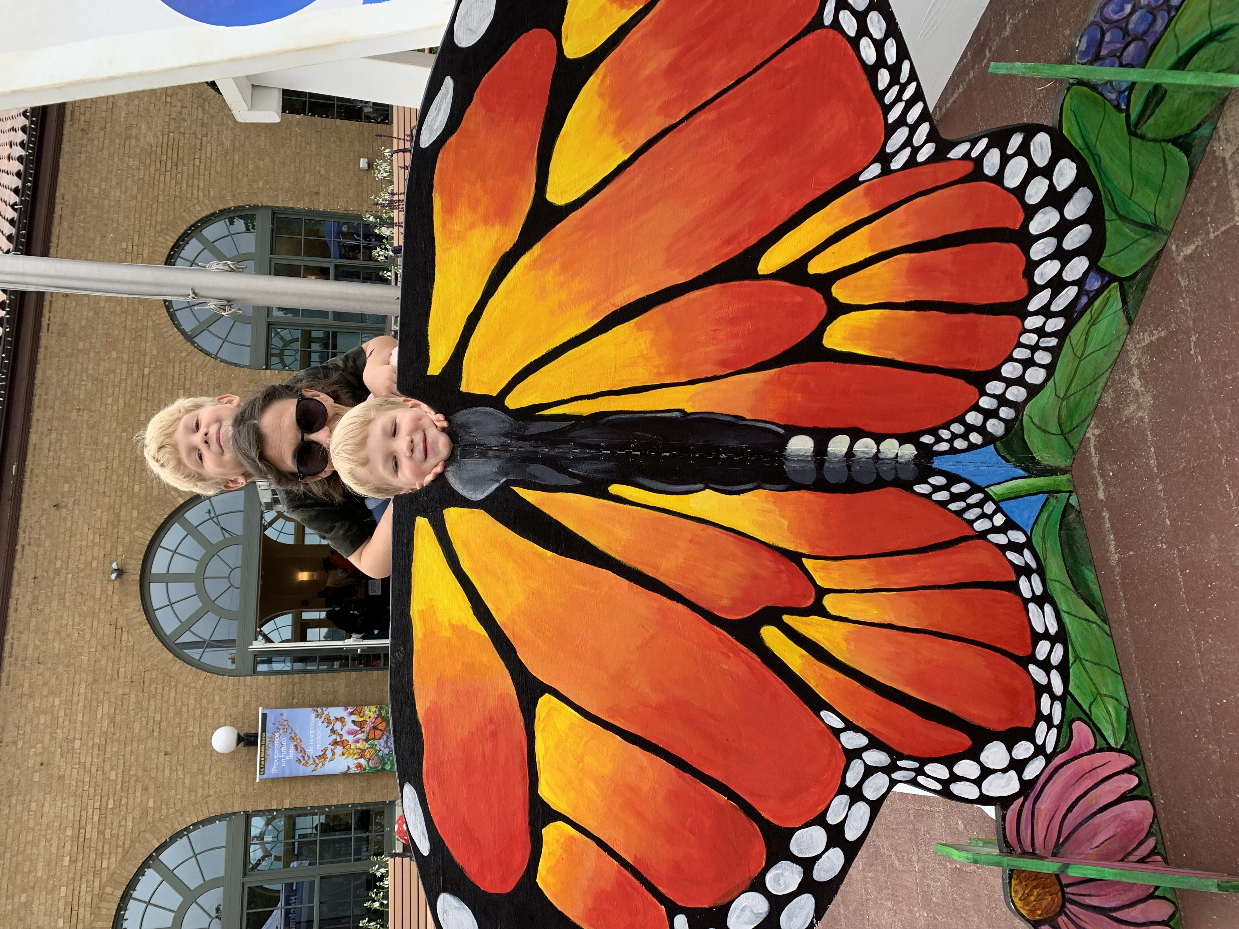 Two small children pose with their mother behind a monarch butterfly cutout.