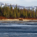A moose along the shore of a partially frozen lake at Kanuti National Wildlife Refuge in Alaska.